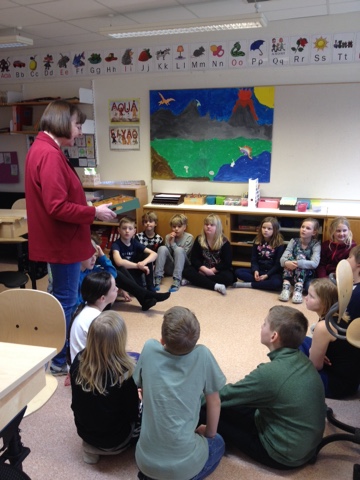 Elverna fick titta och känna på olika föremål från stenåldern som Maja hade med sig.